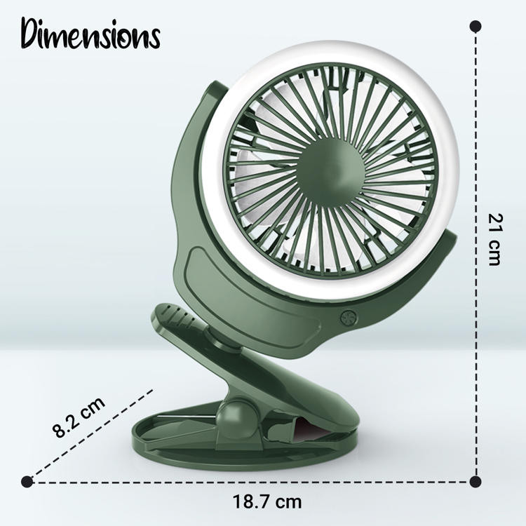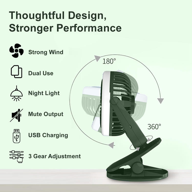 Equipped with a 1200mAh lithium battery and USB charging capability, the fan delivers 120 to 180 minutes of operation. Its 360° adjustable head allows flexible airflow direction, ensuring fresh air circulation during warm weather. The built-in light adds extra convenience for low-light environments, while the universal clip with rubber-coated grip prevents scratches and ensures secure attachment.