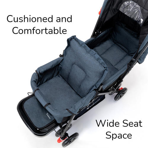 Crafted with linen fabric and cushioned seats, the stroller offers added comfort for everyday use. A large cart basket provides space to carry essentials for two babies, while swivel front wheels with foot-activated locks enhance maneuverability and stability. The single-hand folding system makes it easy to store and transport when traveling.