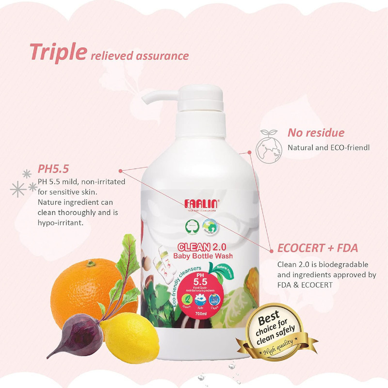 Farlin Clean 2.0 Baby Bottle Wash Liquid Cleanser 700ml Pump Top is specially formulated with plant-based ingredients to provide effective and safe cleaning for baby feeding bottles and accessories. With a natural pH 5.5 formula, it is mild and non-irritating, making it suitable for daily use.