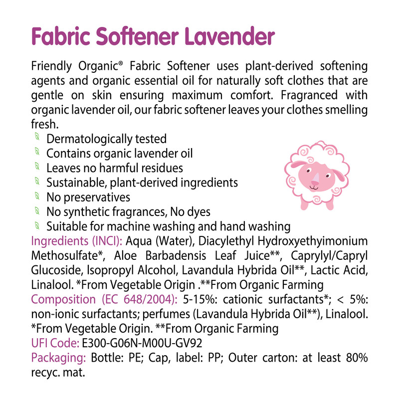 | Friendly Organic® Lavender Baby Fabric Softener uses plant-derived softening agents and organic essential oil to provide naturally soft clothes that are gentle on skin and ensure maximum comfort. Fragranced with organic lavender oil, it leaves clothes smelling fresh after every wash.Formulated with sustainable plant-derived ingredients, this ecological fabric softener is suitable for both machine washing and hand washing. Certified ICEA - Eco bio Cleaners and Vegan, it offers a safe and environmentally friendly solution for your family’s laundry care. |