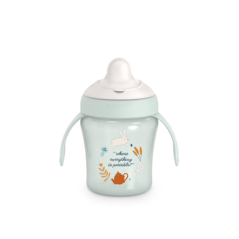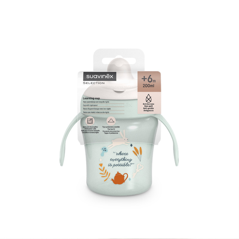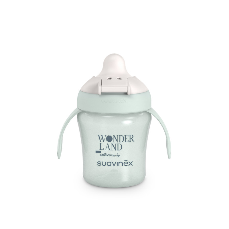 The Suavinex Wonderland Training Cup is designed for babies 6 months and older. It features removable handles that allow babies to gain independence while drinking. The ergonomic shape is specifically designed for small hands, making it easy to hold. It comes with a spill-proof system to prevent drips and stains, a rigid, tear-resistant spout, ideal for teething babies, and a protective cap for added hygiene. This training cup is dishwasher-safe and is made from BPA-free materials for safe use.