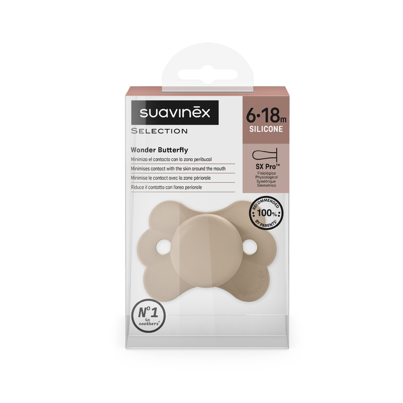 The Suavinex SX Pro Ultra Soft Butterfly Pacifier for babies aged 6–18 months is designed to respect the baby’s oral development while providing a natural and comfortable experience. Its butterfly-shaped shield adapts to the baby’s face, supporting ergonomic comfort during daily use.
