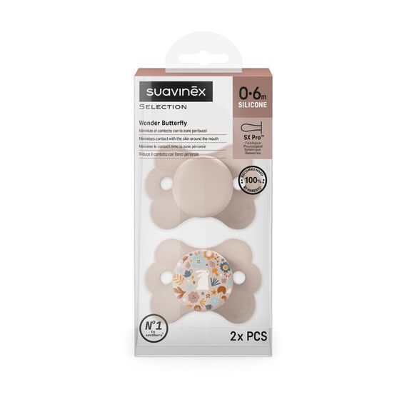 • Pack includes: 2 Suavinex SX Pro Butterfly Shape Pacifiers (0-6 months) in beige.