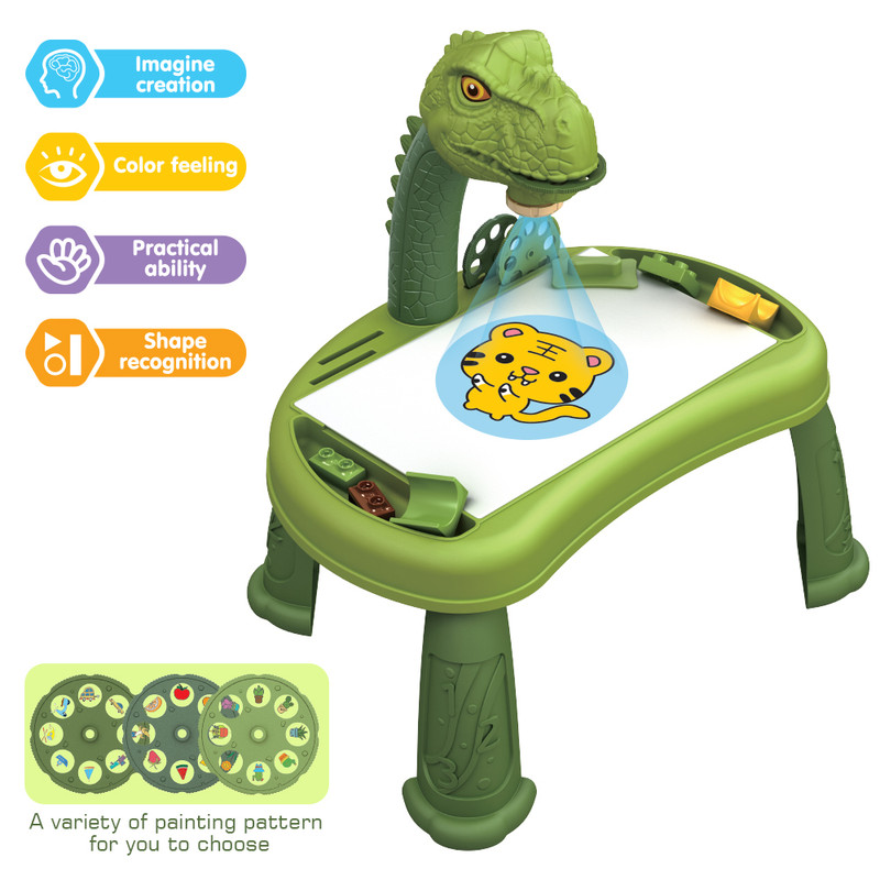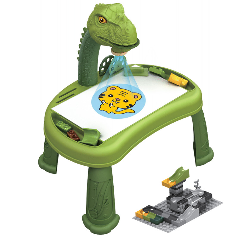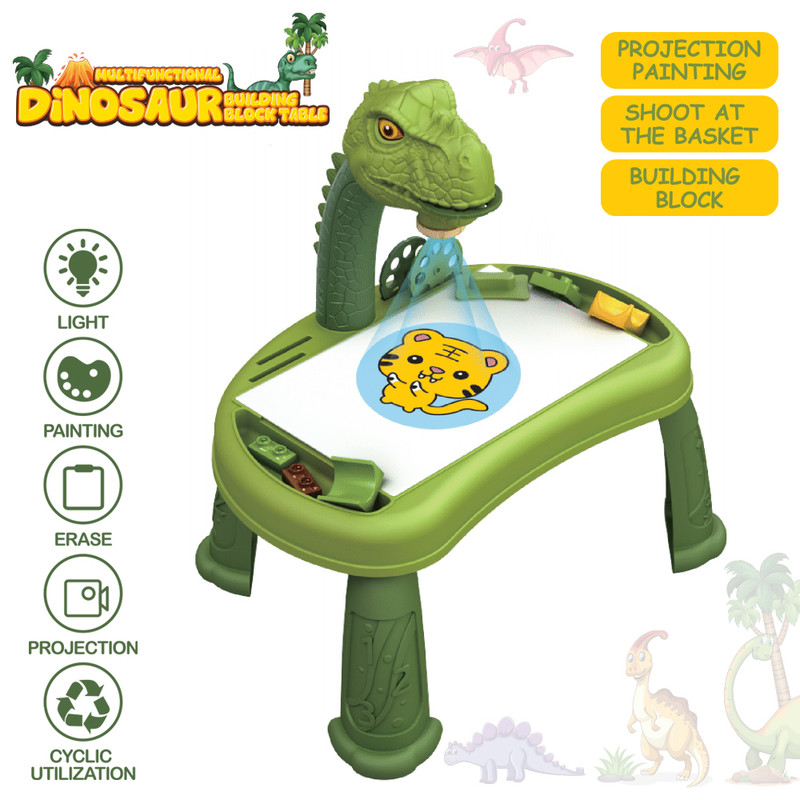 Little Story DIY T-Rex 3-In-1 Spinning Puzzle Block Table & Projection Drawing Board Set by SAMBOX is a fun and educational STEM toy designed to enhance creativity and learning. This versatile set combines a spinning puzzle block table, projection drawing board, and learning table in one exciting product.