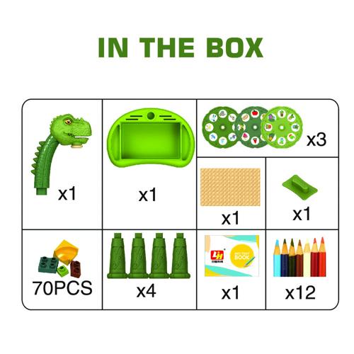 • What's in the Box: 1* T-Rex 3-In-1 Table Set, 12 Colors, 1 Notebook, 1 Eraser, 3 Projection Slides (24 Patterns), 1 Block Board with 70 Blocks