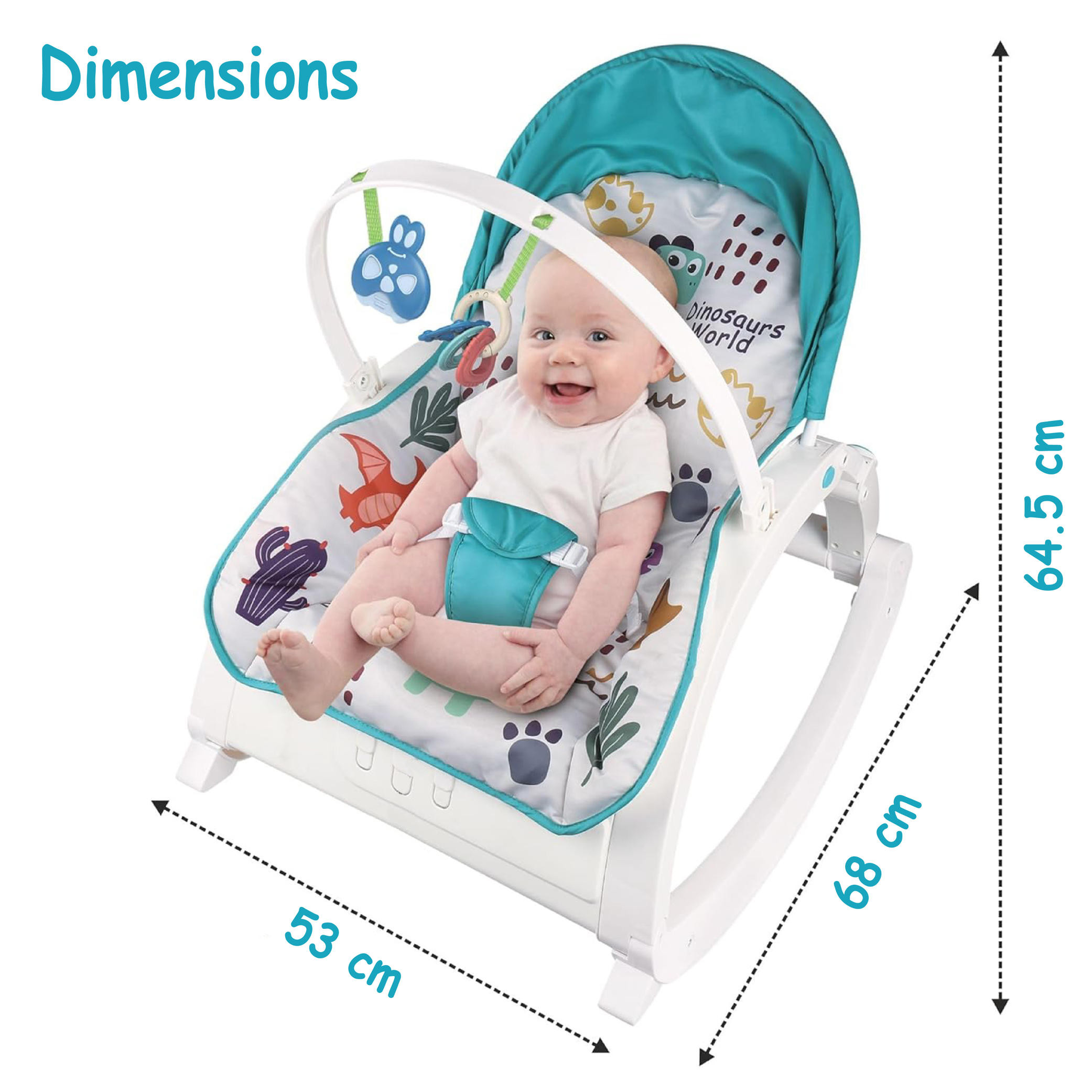 The Teknum Multifunctional Rocker / Feeding Chair / Baby Seat / Recliner in Dinosaur Blue is a versatile all-in-one solution designed to provide comfort, entertainment, and safety for your baby from birth up to 36 months. Featuring a playful dinosaur print, it creates a cheerful and engaging environment for your little one.